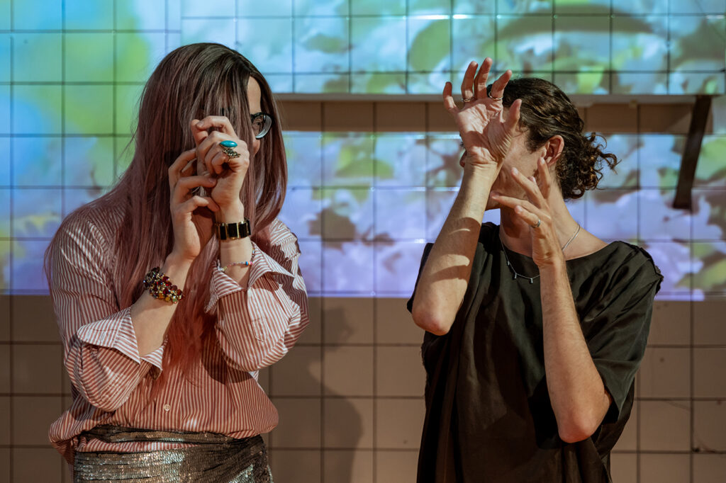 Amina Szecsödy (*1995) is interested in historical views of the female body and voice as disruptors of power. She combines elements from the media, cinema and mythology, interweaving voices, images and stories from the past and future in the immediate present. Her performance Mean Time explores the relationship between present and future through the figure of a female oracle and reflects on the role of language and the power of words.