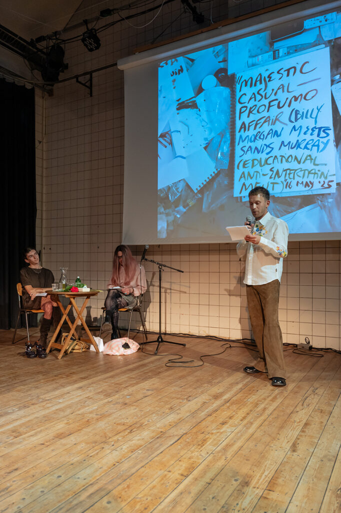 Majestic Casual — Profumo Affair: Billy Morgan meets Sands Murray (Educational Anti-Entertainment) is a collaboration between artists Billy Morgan and Sands Murray-Wassink and Titus Nouwens. It marks the first public outcome of Prelude, a series of live events emphasising interconnections and influences between moving image and performance, and between visual artists of distinct generations.
